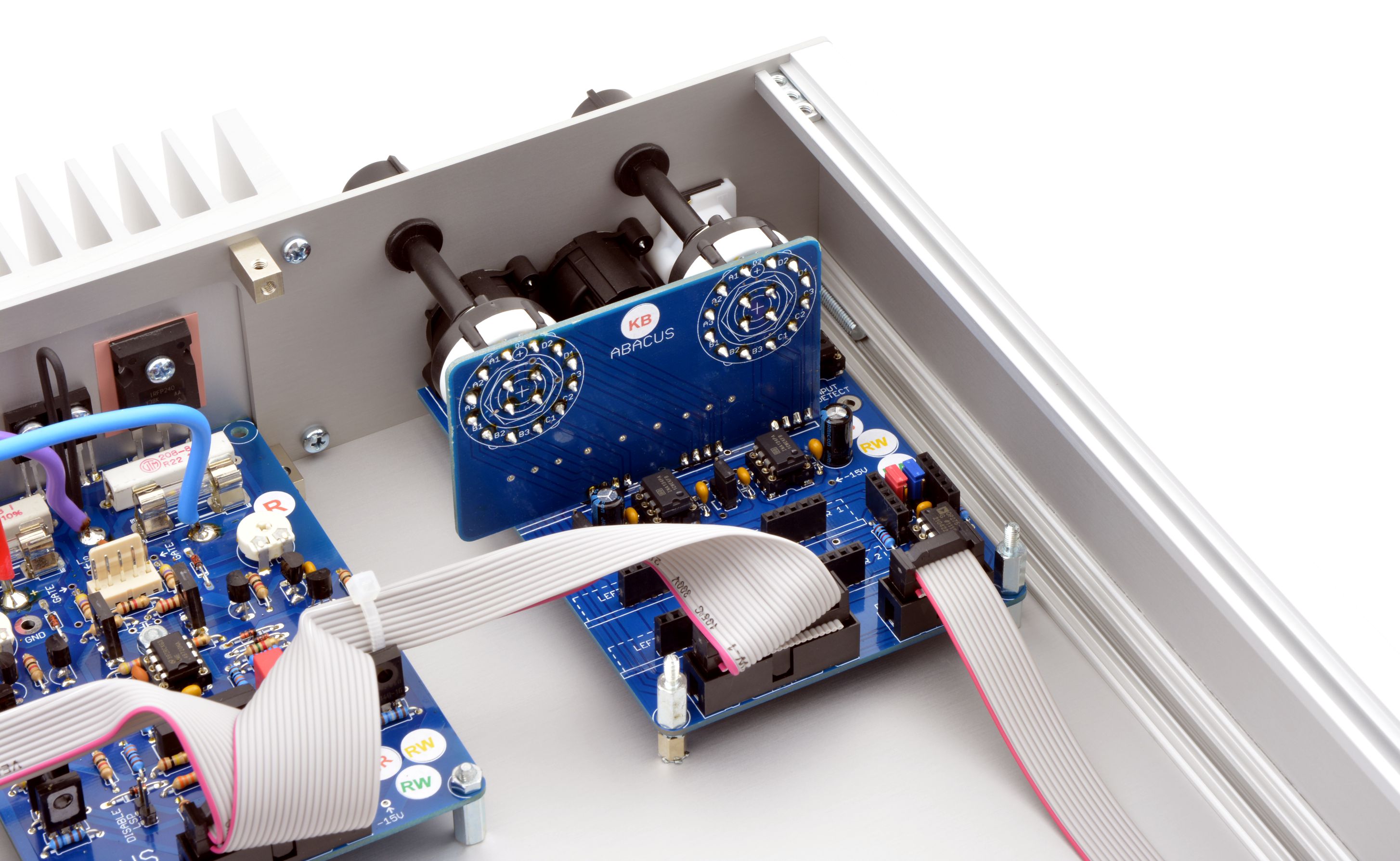 Für die Zusammenarbeit mit ABACUS OEM-Partnern wurden Steckplätze für aktive Filtermodule in die Eingangsplatine integriert, sowie ein DSP-Board entwickelt. Diese stehen für verschiedene Anwendungen wie z.B. externe Aktivierung oder Bassentzerrung auch für DIY-Zwecke zur Verfügung.
