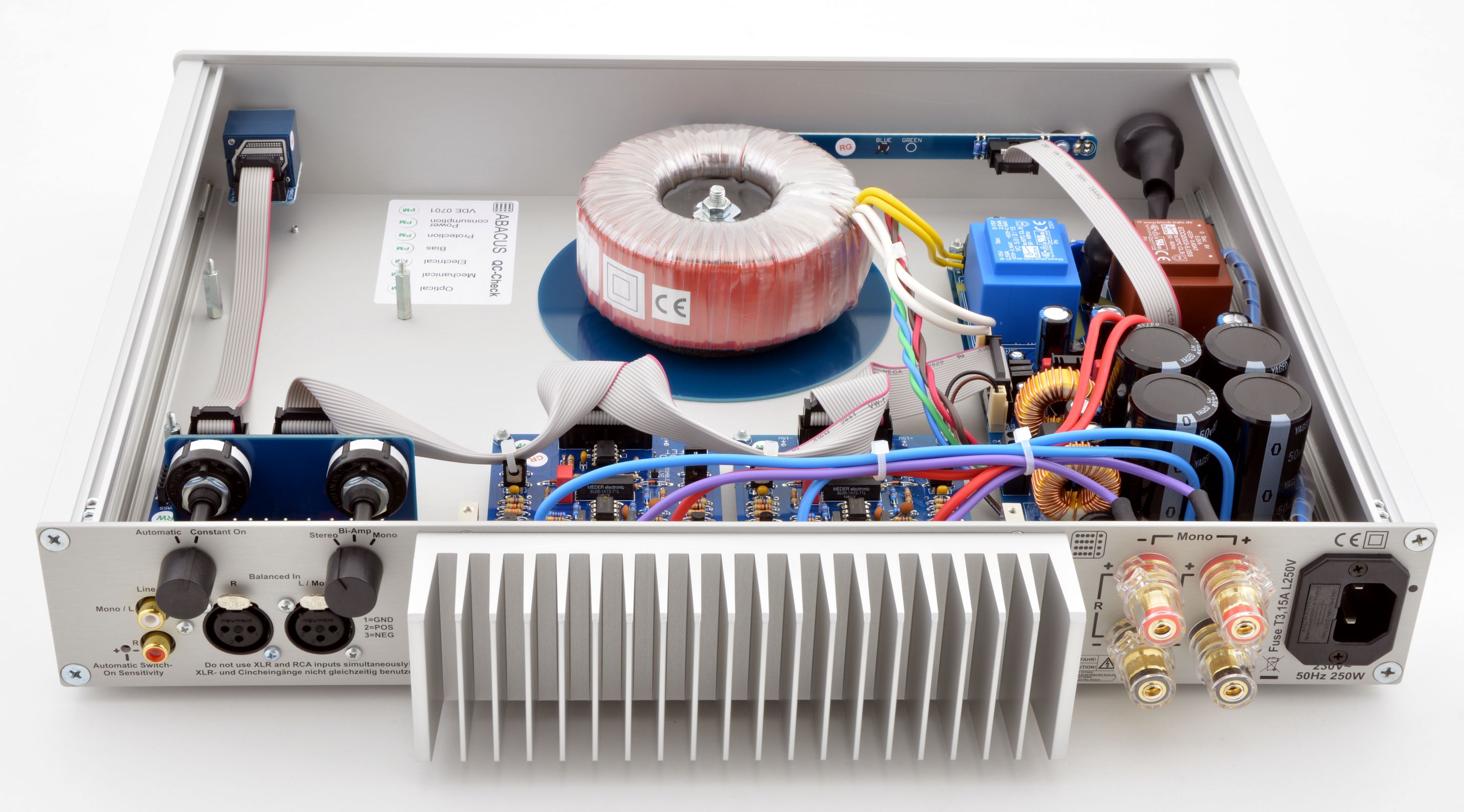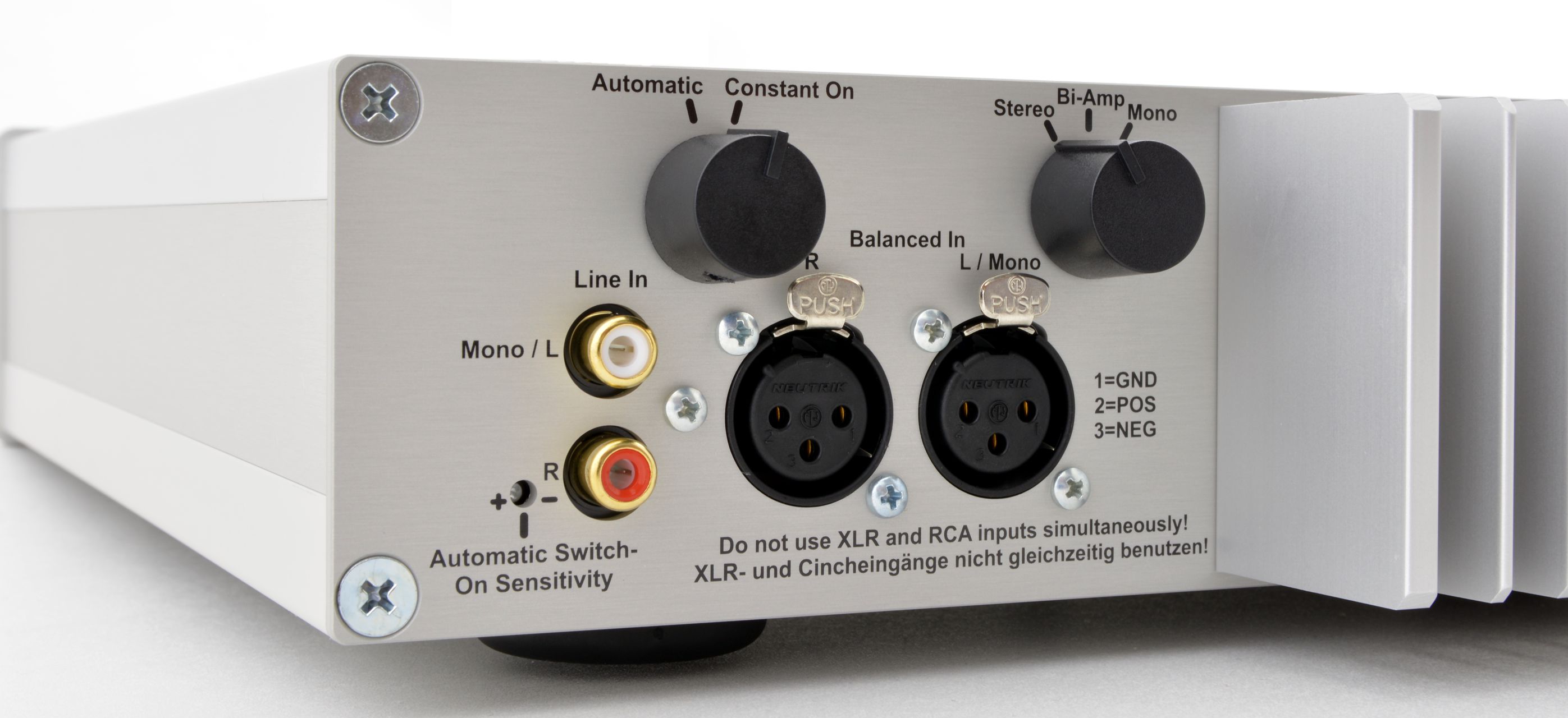 - Umschaltung Stereo/BiAmp/Mono (als Monoblock doppelte Ausgangsspannung)