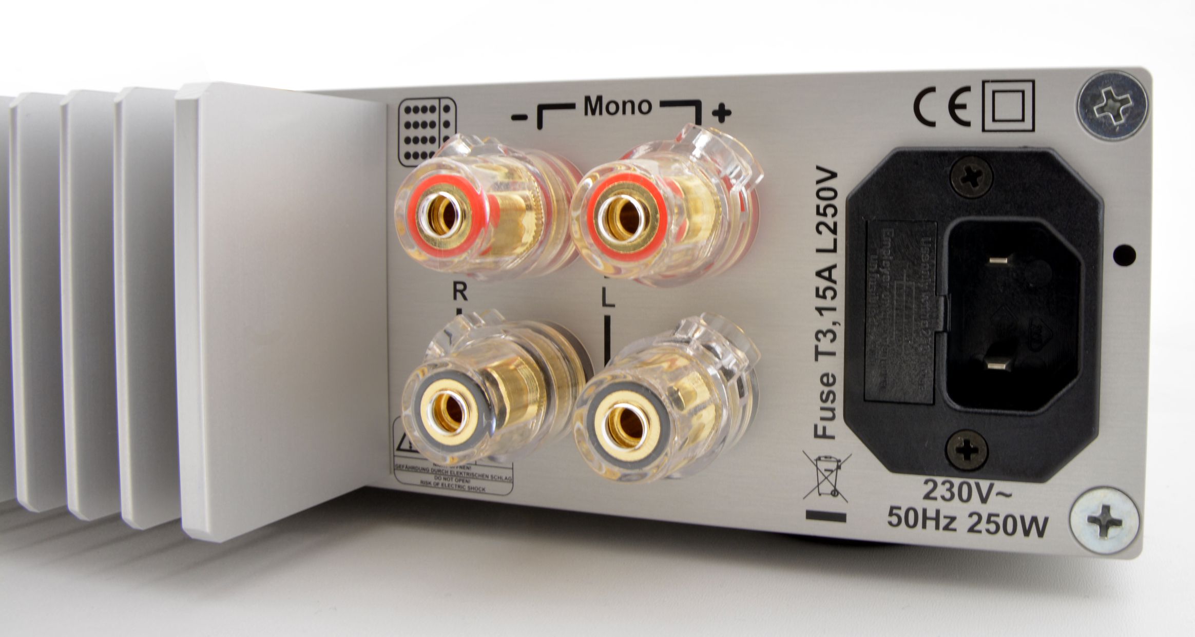 Vollisolierte und vergoldete Lautsprecherklemmen bieten sicheren Kontakt, sowohl für Bananenstecker als auch für dicke Kabelenden. Die Einschaltgeräuschunterdrückung arbeitet ohne sonst übliche Relais im Lautsprecherausgang. So ist der Musik von den Endtransistoren bis zu den Lautsprechern nichts im Weg.