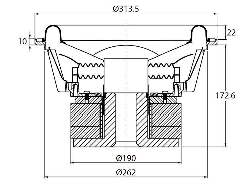 Damit der RSS315HE-22 auch bei hohen Auslenkungen eine präzise Kontrolle über die Membran behält, benötigt er einen unglaublich leistungsstarken Motor. Ein Stapel aus drei hochenergetischen Y-35-Ferritmagneten sorgt für die nötige Kraft und lässt gleichzeitig genügend Spielraum für die Schwingspule, damit diese sich bewegen kann, ohne die Rückplatte zu berühren. Ein Kupferring und eine dicke Aluminiumhülse tragen dazu bei, die gespeicherte Energie zu minimieren und die Induktivität zu verringern, wenn die Spule durch den Motor läuft. Dank dieser massiven Motorbaugruppe ist der RSS315HE-22 in der Lage, extrem geringe Verzerrungen und ein präzises Ansprechverhalten zu erzeugen, selbst wenn er bis an die Grenzen seines 50-mm-Spitzenpegels betrieben wird.