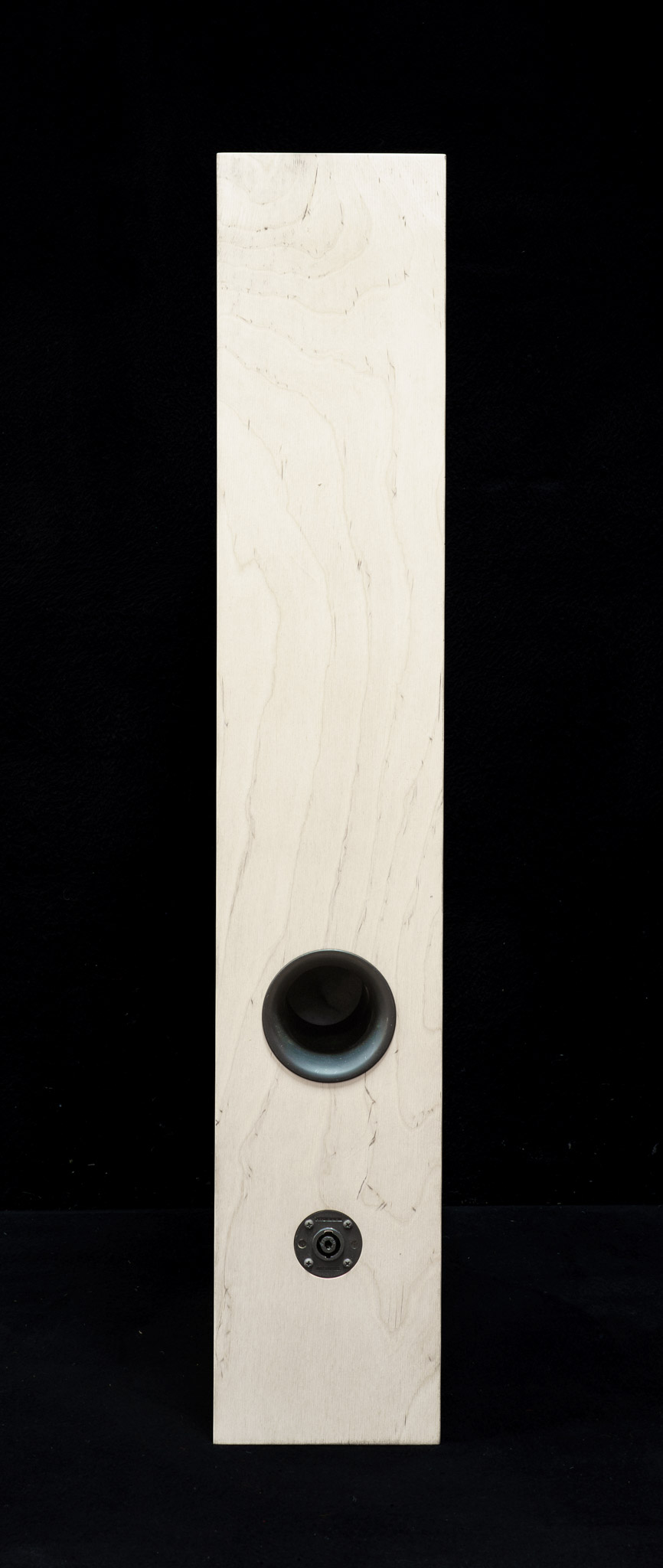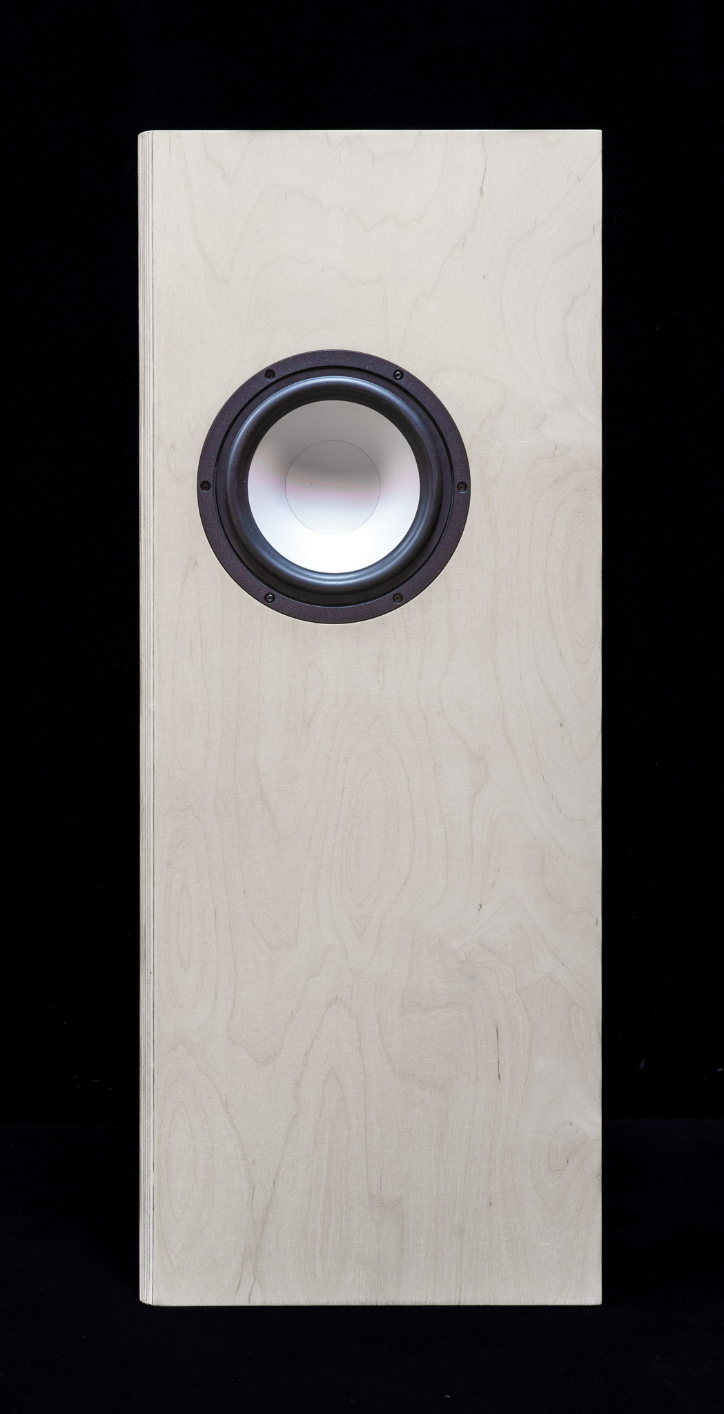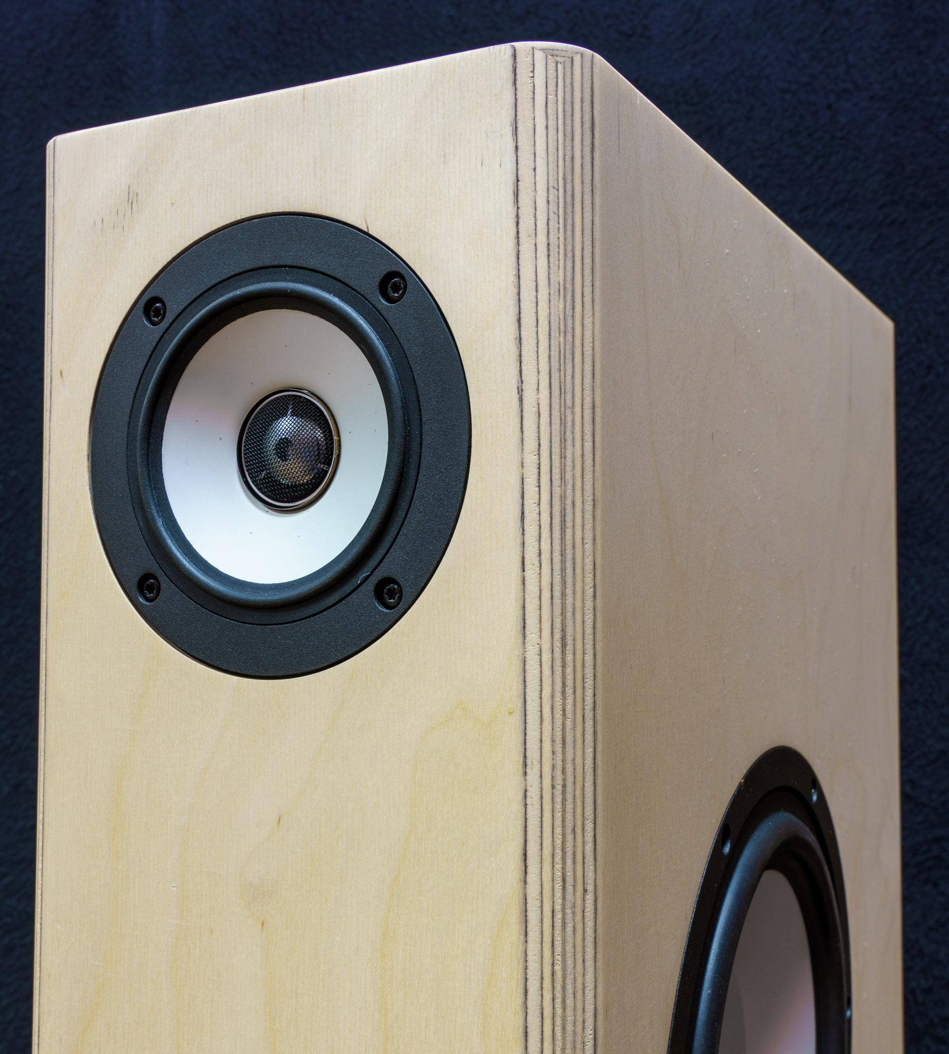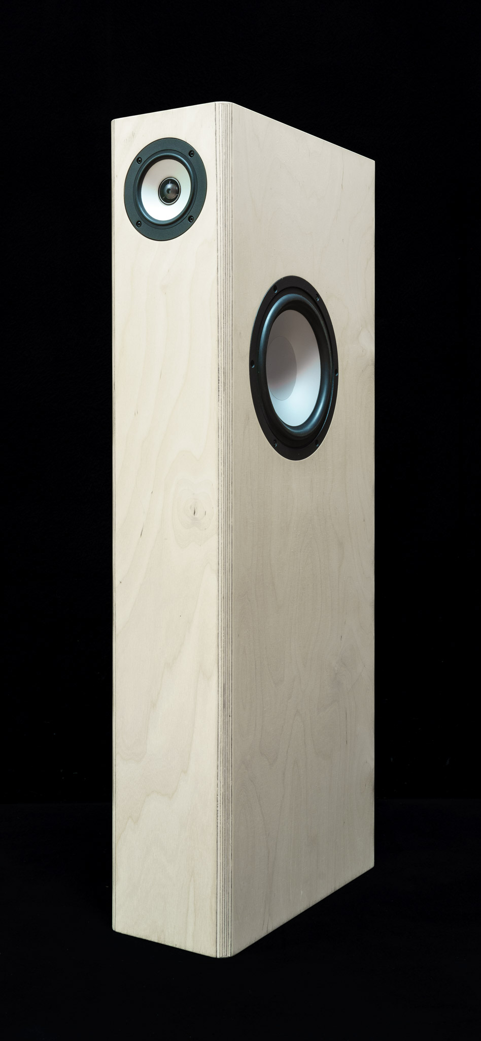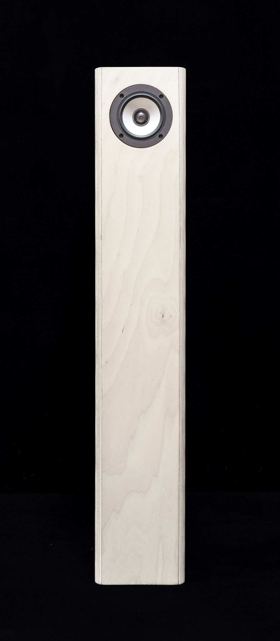 Das Konzept: Schlanke Box mit Wucht. Die Lösung: Koaxial-Chassis (Mitteltöner und Hochtöner) mit 3“ (ca. 11cm) Außendurchmesser in der Front, seitlich ein Langhub-Tieftöner mit 8“ (ca. 22cm) Außendurchmesser.