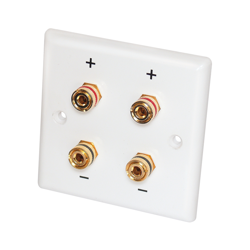 High-quality speaker connection panel for two speakers. Material plastic. Screw connection or connection for banana plug. Can be mounted directly on the standard flush-mounted box. Incl. 2 screws for fixing to the flush-mounted box. Drilling distance 60 mm, installation depth 12 mm, external dimensions 85 x 85 mm. Supplied in blister packaging.